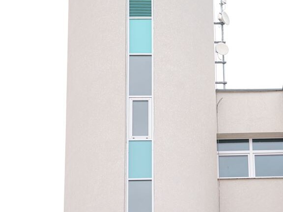 – függőfolyosó korlát üvegtéglák bontása, rács elhelyezése (felső két szint zárt üvegtéglás folyósón nincs csere)