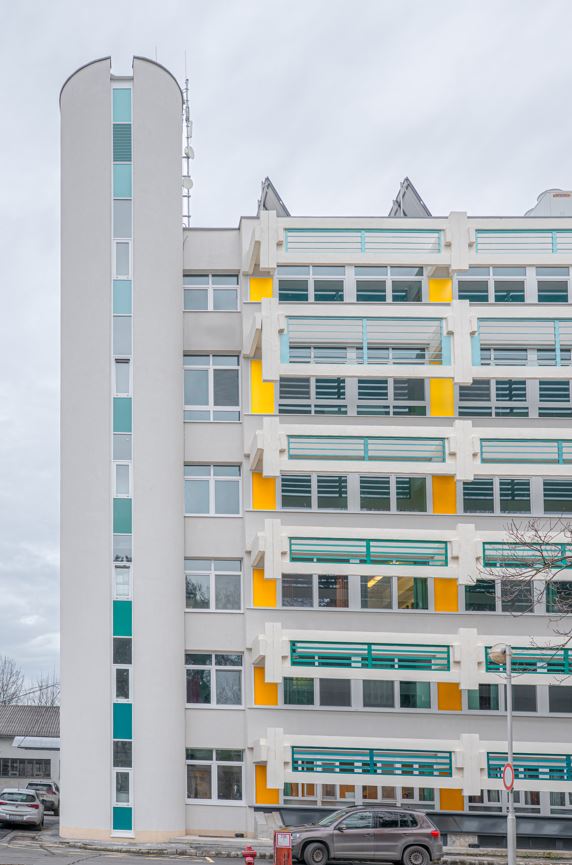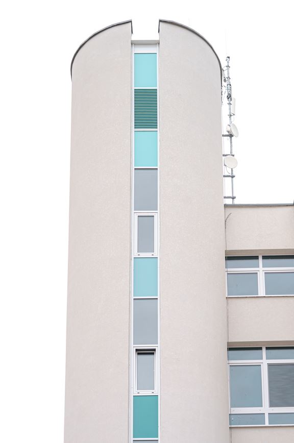 A pillérvázas épület homlokzati tartópillérei alaprajzilag „U” alakúak, a pillér kifelé fordul, az „U” formában vezették a fűtési csöveket, amit kívülről fa deszkával zártak le. Ezeket a gépészeti starngokat is lehőszigeteljük és időtálló, szálcement lapokkal zárjuk le.